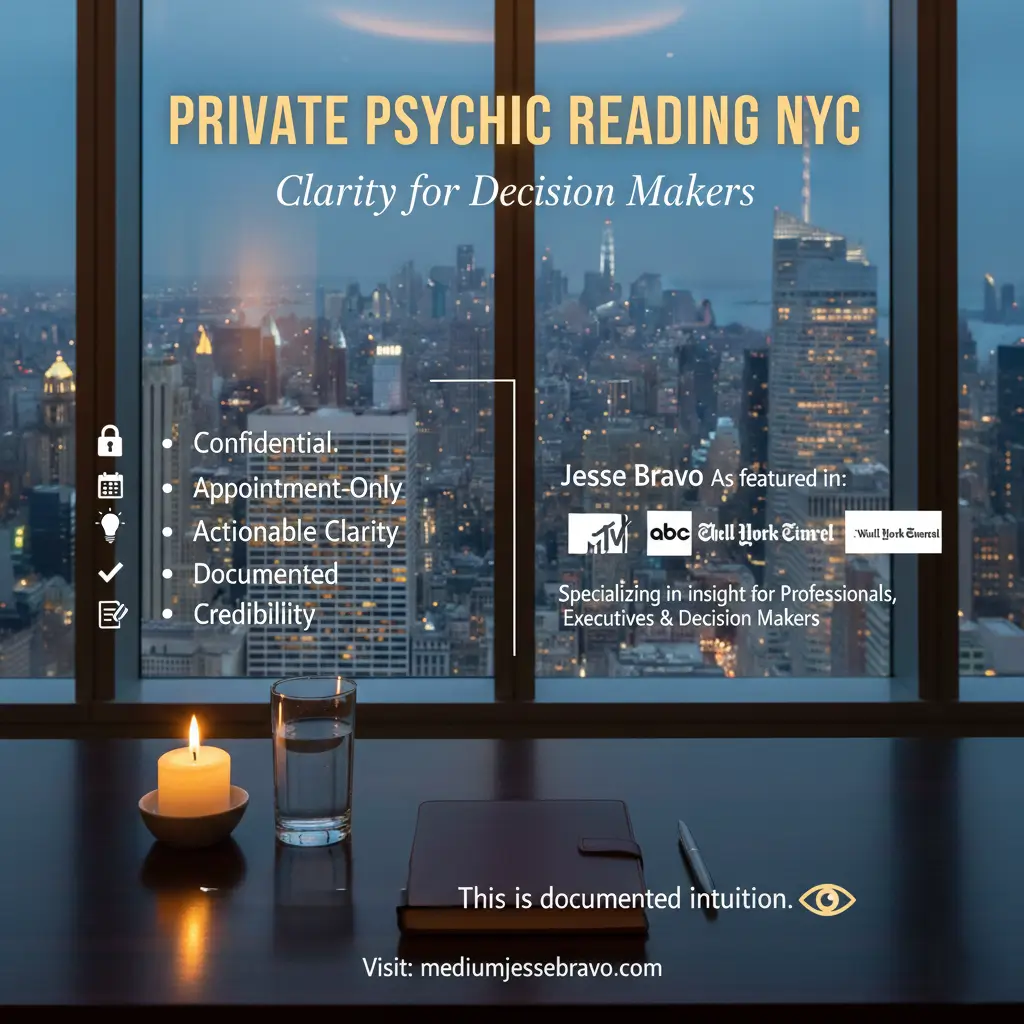 If you are searching for a private psychic reading NYC clients trust, privacy and credibility matter. Most importantly, you want clarity you can use immediately. Instead of vague language or dramatic presentation, you receive direct insight built around real decisions. Jesse Bravo provides confidential, appointment-only sessions in Manhattan. As a result, professionals, executives, and decision makers book when timing matters most.