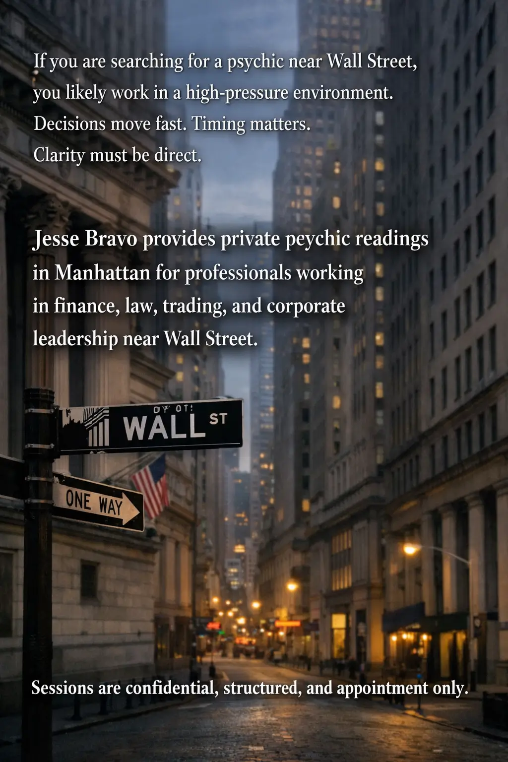 If you are searching for a psychic near Wall Street, you likely work in a high-pressure environment. Decisions move fast. Timing matters. Clarity must be direct. Jesse Bravo provides private psychic readings in Manhattan for professionals working in finance, law, trading, and corporate leadership near Wall Street.